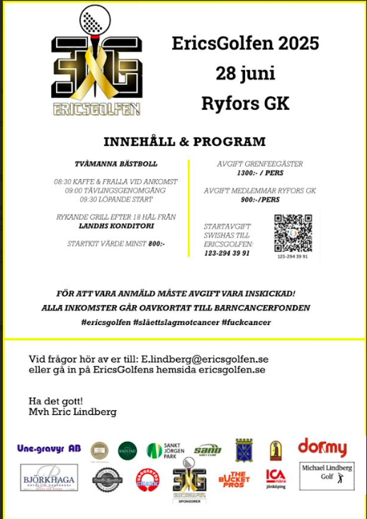Hej mitt namn är Eric Lindberg och jag anordnar välgörenhets golftävlingen ERICSGOLFEN. Jag hjälper även gärna till med ditt eget golfevent för företag och privatpersoner. Välkomna att höra av er och delta i tävlingen, eller låt oss hjälpa er med ert egna golfevent.