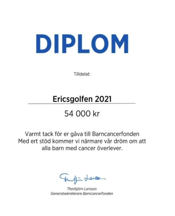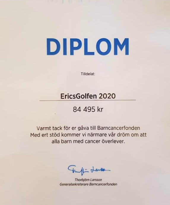 Mitt namn är Eric Lindberg. Jag drabbades av cancer, en hjärntumör, när jag var 6 år gammal. Jag fick en så kallad ”PNET" som bara cirka 20% överlever. Eftersom jag bara var 6 år gammal så minns jag inte riktigt allt. Men det var en hemskt jobbig tid då man var borta från vänner och släkt. Jag spenderade nästan två år på Linköpings sjukhus där jag opererades och behandlades med cellgifter och strålning. Efter ett par år med återbesök och kontroller blev jag friskförklarad, och idag har jag ingen cancer. När jag var 13 år fick jag epilepsi, en komplikation från min cancerbehandling. Vissa dagar kunde jag få fyra kramper på en och samma dag. Jag testade flera olika mediciner men det var ingen som fungerade till 100 %. Till slut fick jag göra en operation då de gick in i mitt ärr i huvudet och "förfinade", skrapade på ytan” där det fanns epileptisk aktivitet. Efter operationen var jag utan kramper i tre år och åt samtidigt medicin. När jag var 16 år kom kramperna tyvärr tillbaka vilket gjorde att jag fick göra en andra operation. Efter den andra operationen har jag mått väldigt bra och medicinerna fungerar som de ska. Men när jag trodde allt var klart med sjukhus och operationer blev mitt ärr infekterat och jag fick operera bort mitt skallben. Det skulle jag säga var den jobbigaste perioden i mitt liv hittills. Då fick jag gå en månad utan skallben. Det var samtidigt vinter och halt så jag var väldigt rädd att jag skulle ramla och slå upp hela huvudet. Samtidigt beslutade jag att hoppa av gymnasiet för jag halkade efter i studierna dels på grund av operationerna men mest för jag mådde väldigt dåligt. Efter en månad fick jag göra en operation till då de opererade in en skallbensprotes. Jag är sjukt tacksam för att jag lever idag. Utan den fantastiska forskningen om barncancer hade jag nog inte klarat mig. Därför är det så viktigt att vi fortsätter att samla in pengar till just forskningen om barncancer. Jag arrangerar något som heter Ericsgolfen. Jag vet hur jobbigt och rent ut sagt förjävligt det är att ha cancer och spendera så mycket tid på sjukhus. Golf är ett av mina stora intressen här i livet, Så varför inte arrangera en golftävling där man samtidigt samlar in pengar till forskningen om barncancer. Så att vi en vacker dag kan bota alla barn med cancer. För barn och cancer hör inte ihop.